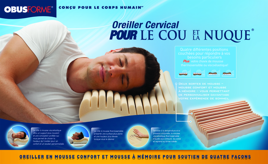 - During the night, your body needs to be in a well-supported and relaxed position to allow it to rest and recover from the wear and tear of your daily activities. Neck pain, tense shoulders and headaches can all result from poor sleep posture. Now you can choose the sleep products that are right for you from Obus Forme’s extensive line of Contoured (Cervical) Pillows, Traditional Pillows and MattressToppers - all engineered to give your entire body a better night’s rest.