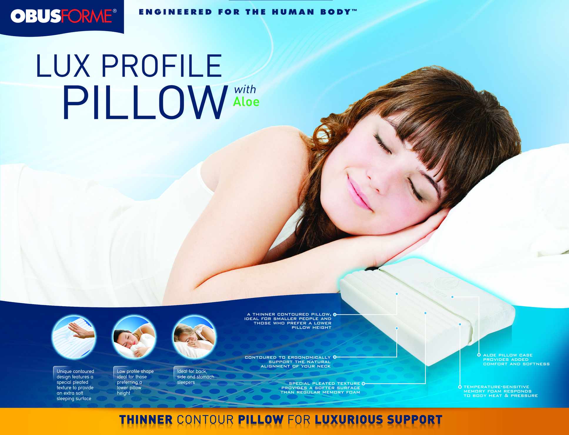 - During the night, your body needs to be in a well-supported and relaxed position to allow it to rest and recover from the wear and tear of your daily activities. Neck pain, tense shoulders and headaches can all result from poor sleep posture. Now you can choose the sleep products that are right for you from Obus Forme’s extensive line of Contoured (Cervical) Pillows, Traditional Pillows and MattressToppers - all engineered to give your entire body a better night’s rest.